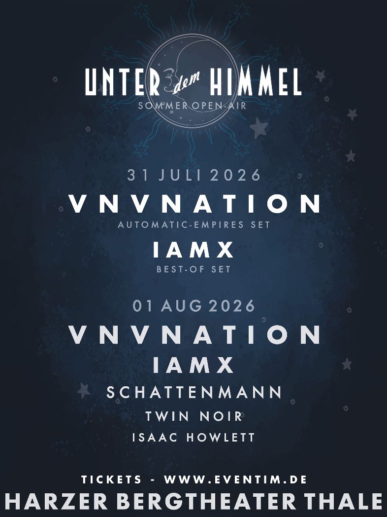 Dates/VNV Nation Unter dem Himmel 31.07.2026 00:00 DE Thale / Harzer Bergtheater Tickets Map Share Share page Facebook Twitter Whatsapp FB Messenger Pinterest E-Mail Zwischenablage